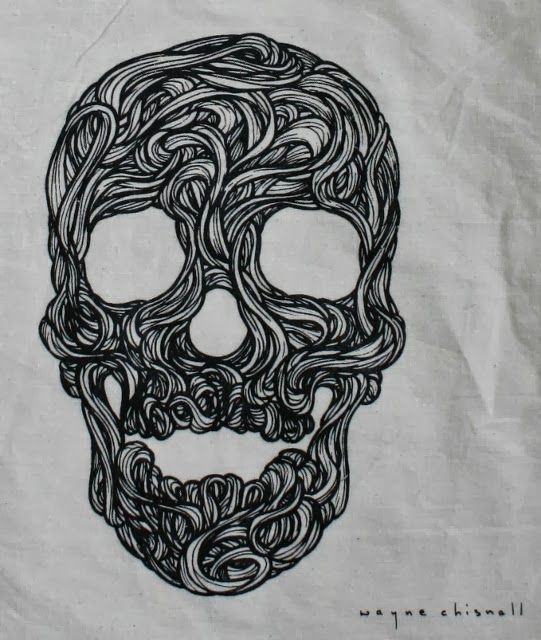 The lovely folk at Tenderproduct (the merchandise store linked to the Tenderpixel gallery - both located in Cecil Court WC2N 4HE, just off Leicester Square in London) have asked me to produce a small edition of tote bags featuring my Swirly Skull design. The shop already sells my Spidey Pods screen prints, along with both my Swirly Skulls and Swirly Skulls on Pink screen prints. Because of the popularity of the skulls prints they thought it would be ideal as a bag design – and also a lot more affordable.