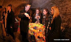 This photo of Yoshi's (using a fish eye lens) shows me explaining something about my sculpture to three students from the Barbican. To see some of his more experimental pinhole photos from the night check out his blog.